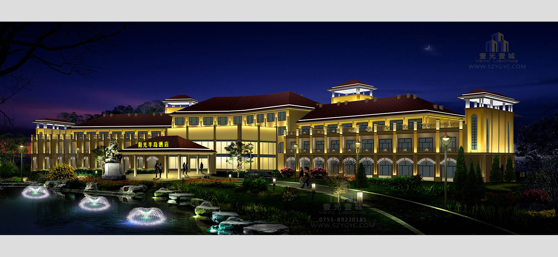 本案设计范围为阳光半岛的酒店建筑部分,包括酒店的立面、顶面部分景观照明设计;以及酒店前后周边绿地、庭院部分照明、酒店主入口门厅的照明、广告标识照明等。